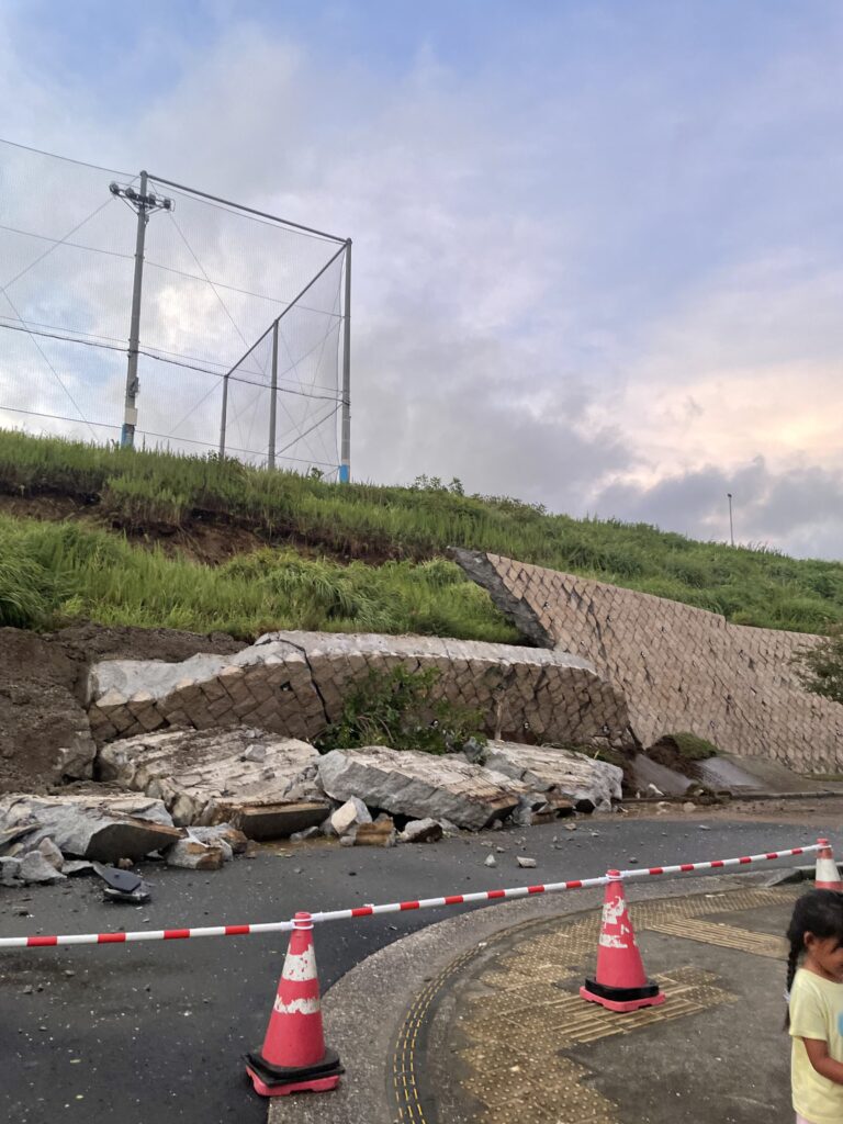 猛烈な雨量で、近くの学校の擁壁が崩落していました。